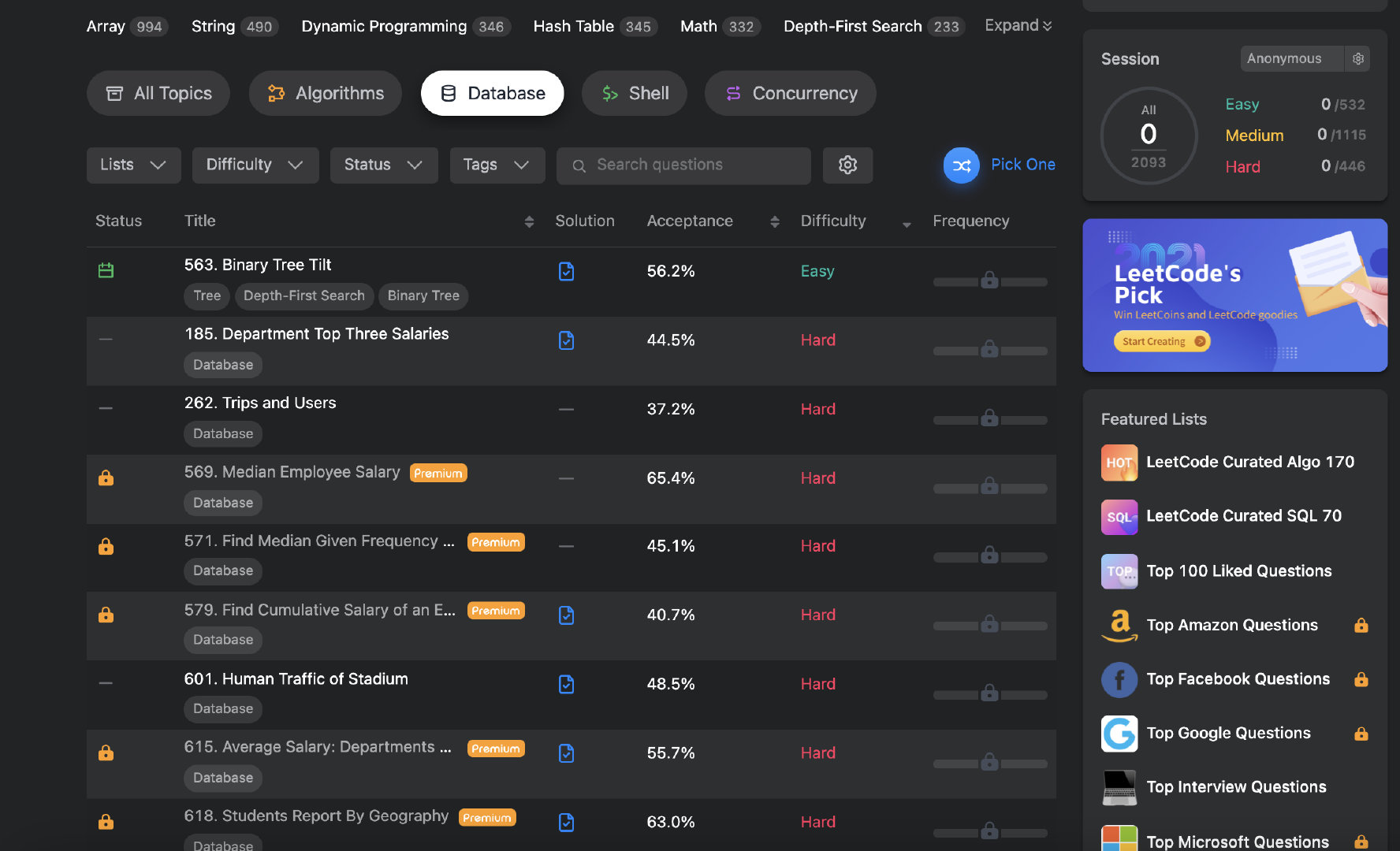 Enter the Problem page and filter the topic of Database, here are all SQL questions.